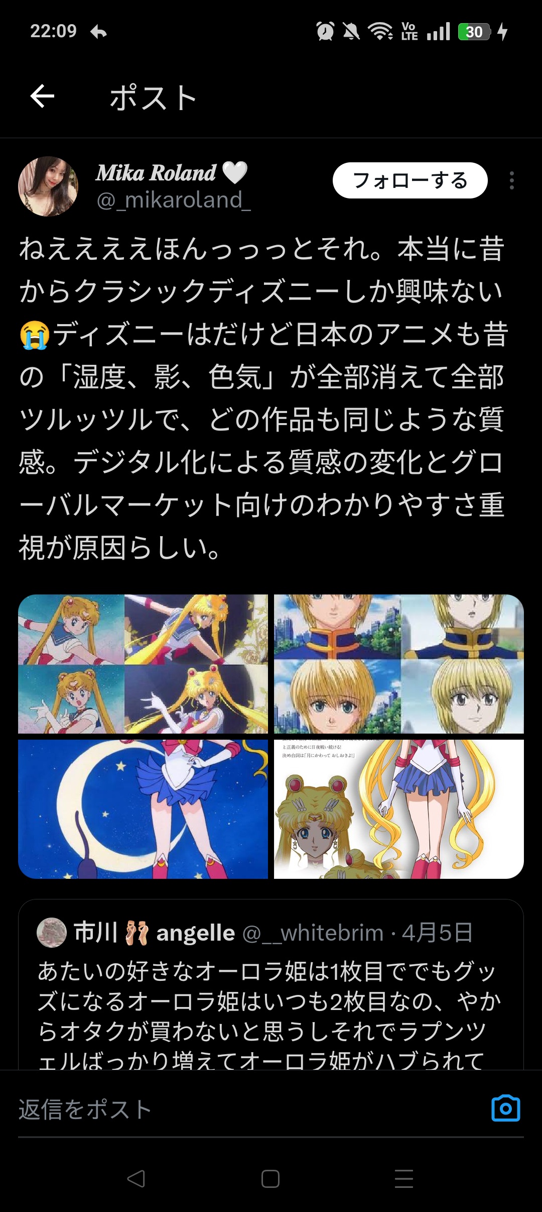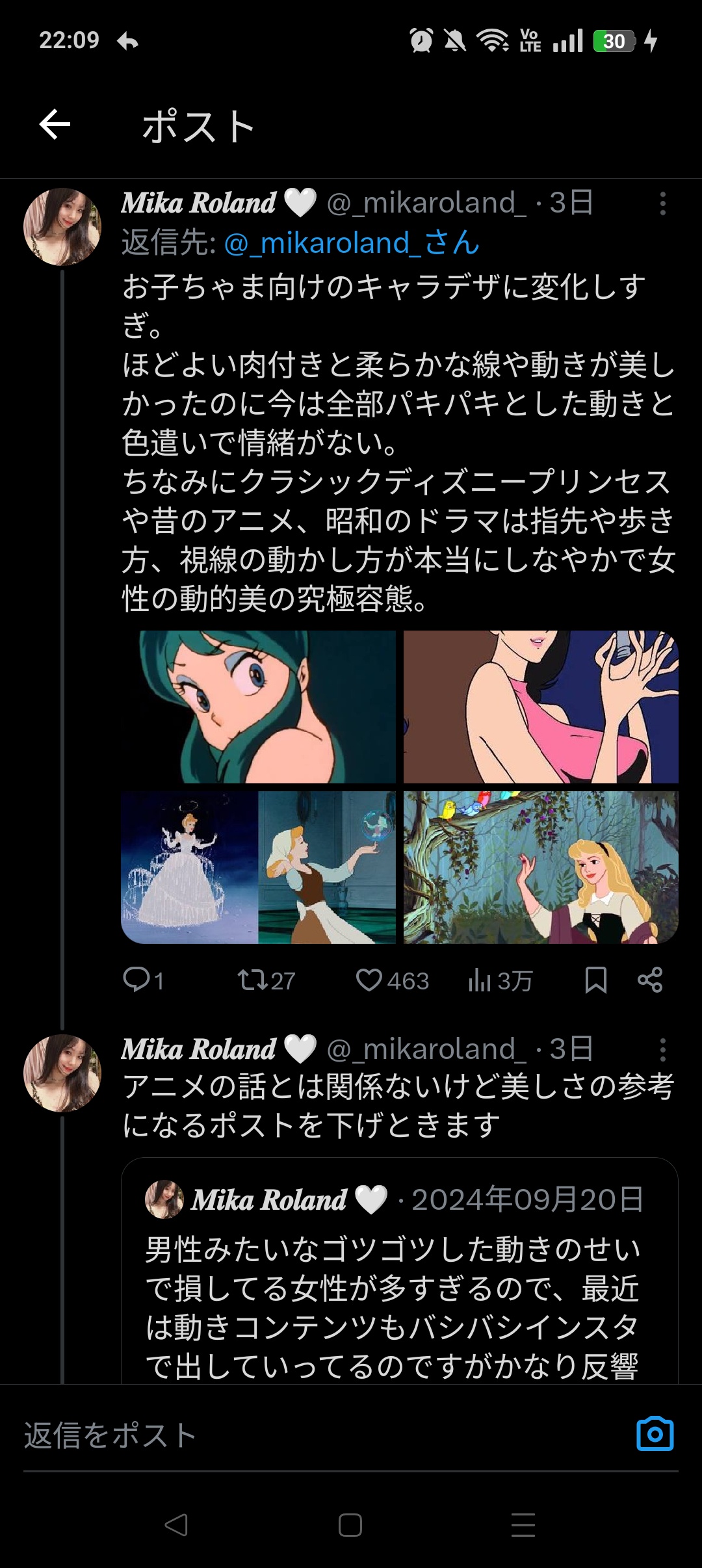 ちなみにクラシックディズニープリンセスや昔のアニメ、昭和のドラマは指先や歩き方、視線の動かし方が本当にしなやかで女性の動的美の究極容態。 pic.twitter.com/LZbTKVW27q— 𝑴𝒊𝒌𝒂 𝑹𝒐𝒍𝒂𝒏𝒅 🤍 (@_mikaroland_) April 8, 2025