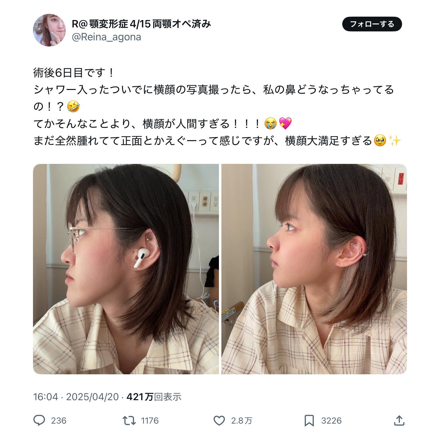 【画像】顎変形症の女さん、整形により大満足の横顔を手に入れる