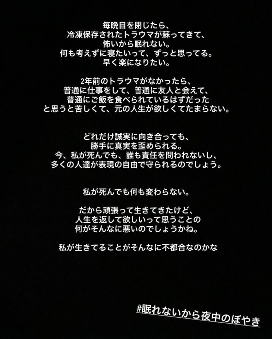 その上で「今、私が死んでも、誰も責任を問われないし、多くの人達が表現の自由で守られるのでしょう。私が死んでも何も変わらない。だから頑張って生きてきたけど、人生を返して欲しいって思うことの何がそんなに悪いのでしょうかね。私が生きてることがそんなに不都合なのかな」と記述している。