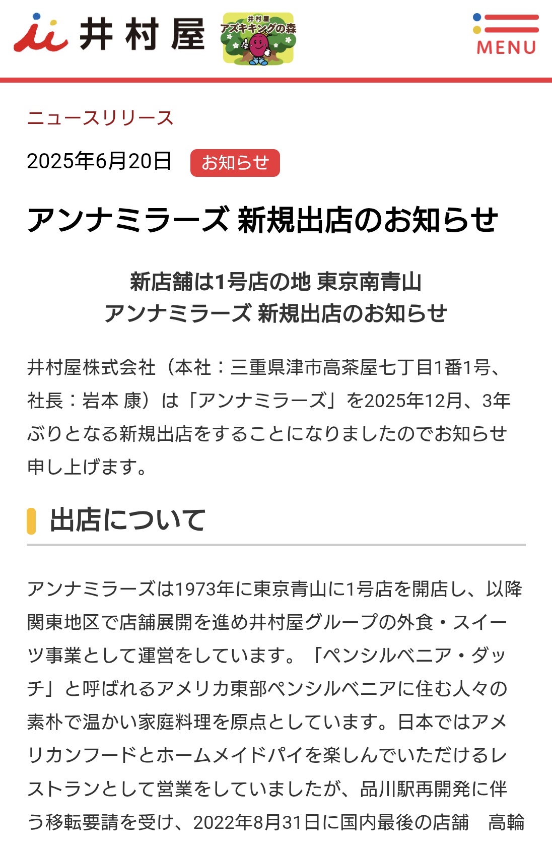 井村屋(津市)は20日、かつて運営していた米国料理やパイのレストラン「アンナミラーズ」の実店舗を約3年ぶりに復活させると発表した。(中略)新店舗は、東京メトロ銀座線外苑前駅近くにあるビルの1、2階に出店する。営業時間は午前9時~午後9時を予定しており、客席数は計約30席。1階にショーケースを設置し、持ち帰りにも対応する。(中略)