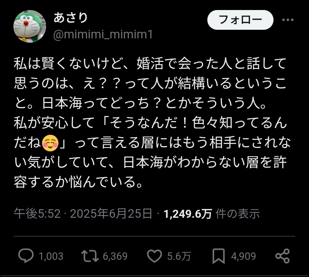 私が安心して「そうなんだ!色々知ってるんだね☺️」って言える層にはもう相手にされない気がしていて、日本海がわからない層を許容するか悩んでいる。— あさり (@mimimi_mimim1) June 25, 2025