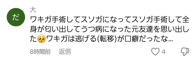 【悲報】ワキガ手術した女さん、負の連鎖に陥り鬱病になってしまう・・