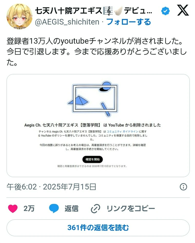 🪽デビュー&10万人感謝! (@AEGIS_shichiten) July 15, 2025