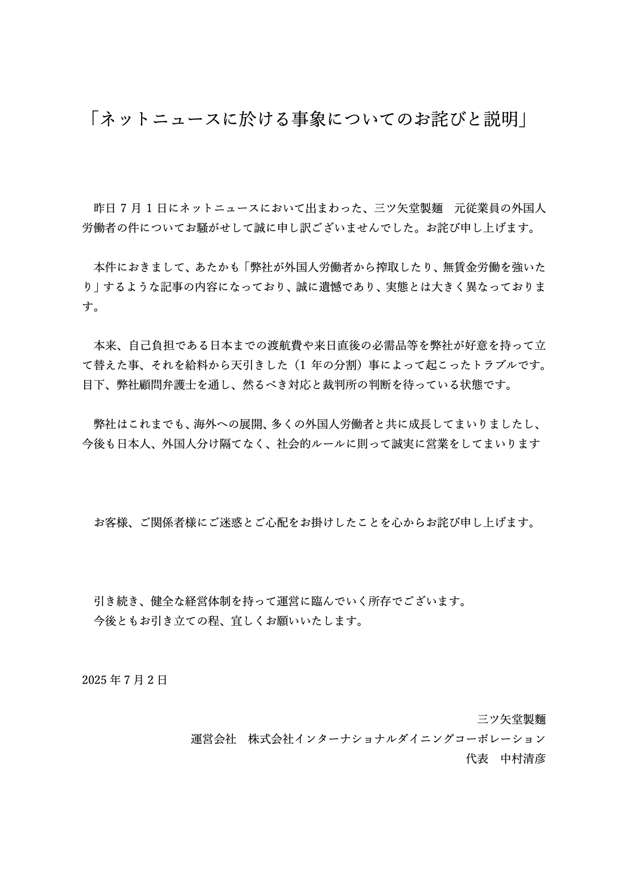 【悲報】153時間働いたミャンマー人の初任給0円にした三ツ矢堂製麺さん、プレスリリース公開