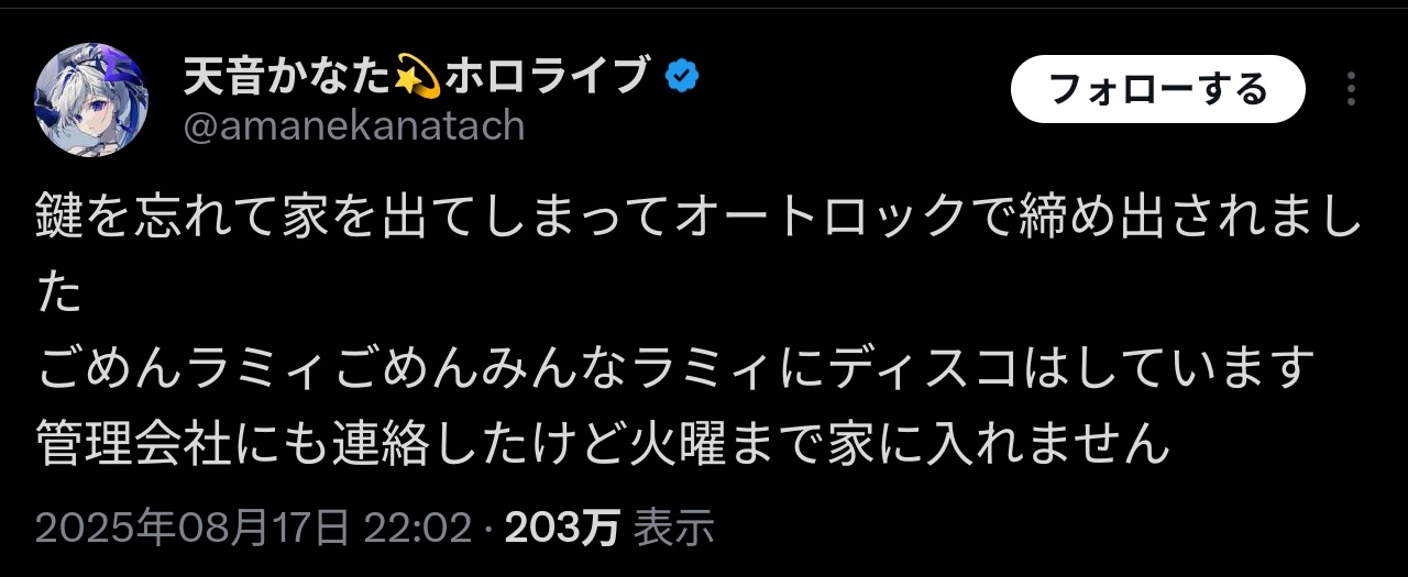 【悲報】大人気VTuberさん、オートロックに閉め出されてしまう…