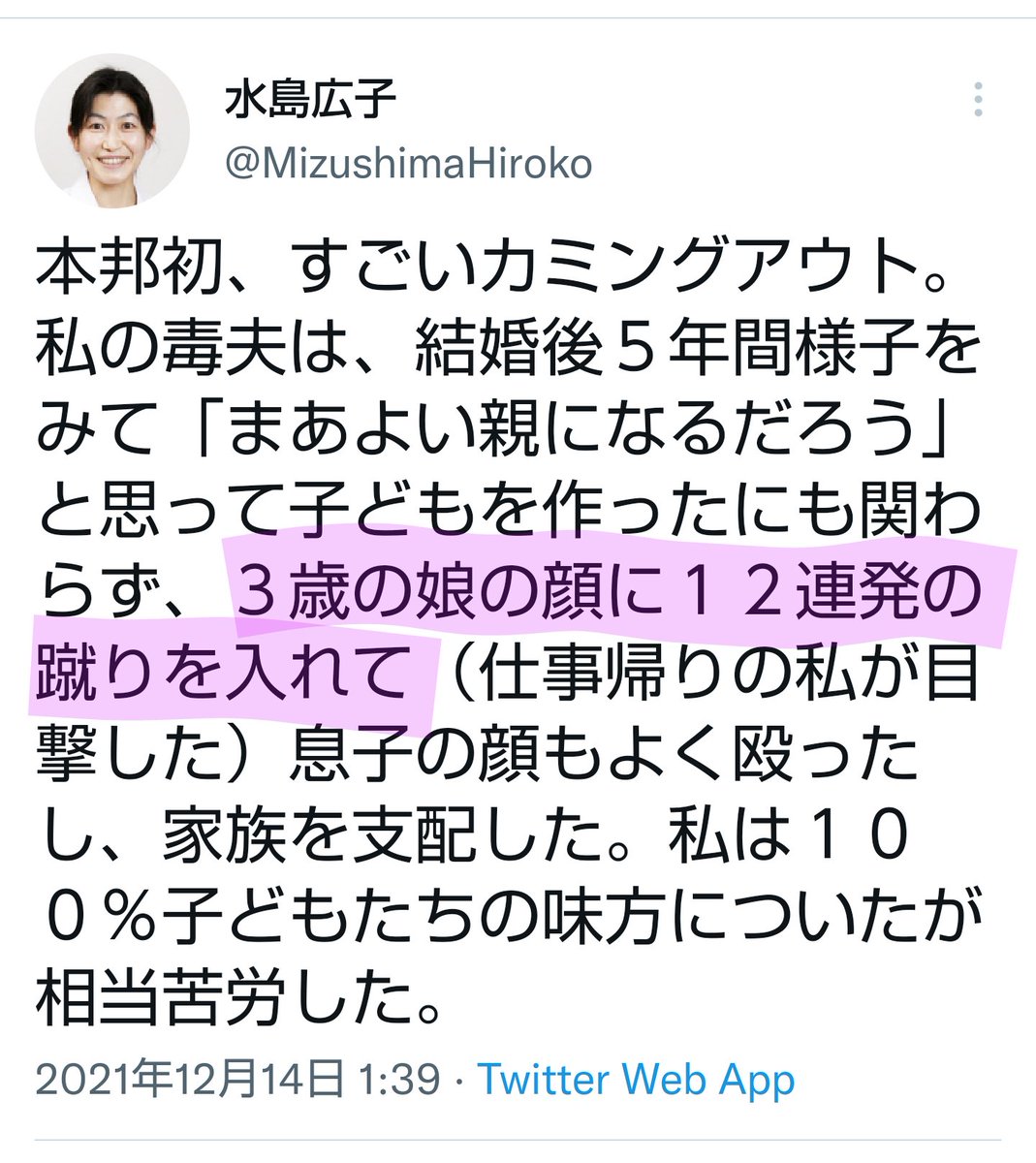 女さん「私が帰ると、そこには娘に12発目の蹴りを入れる夫の姿がありました。12を見たのです」