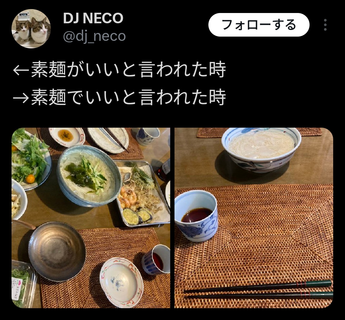 「素麺でいい」を「素麺がいい」と言い換えるだけで滅茶苦茶豪華になる模様wwwwwwww