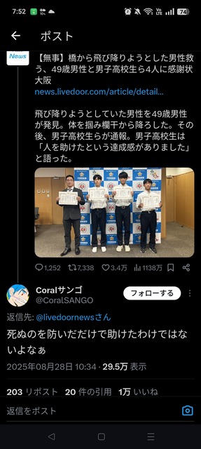 【画像】ネット民、自殺しようとしたオッサンを助けた高校生を叩いてしまう・・・・・