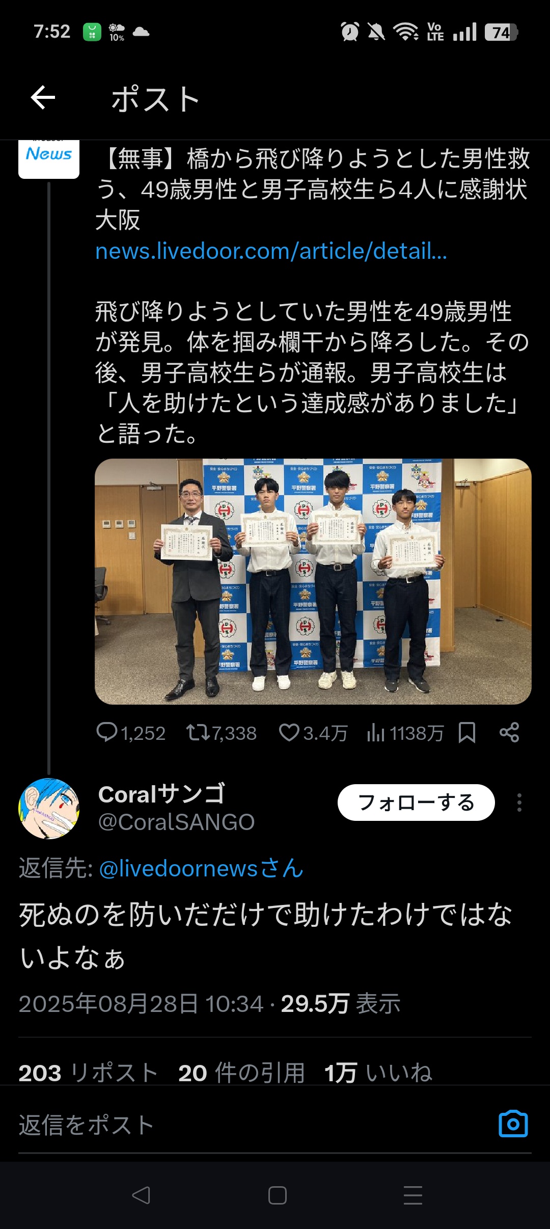 【画像】ネット民、自殺しようとしたオッサンを助けた高校生を叩いてしまう・・・・・