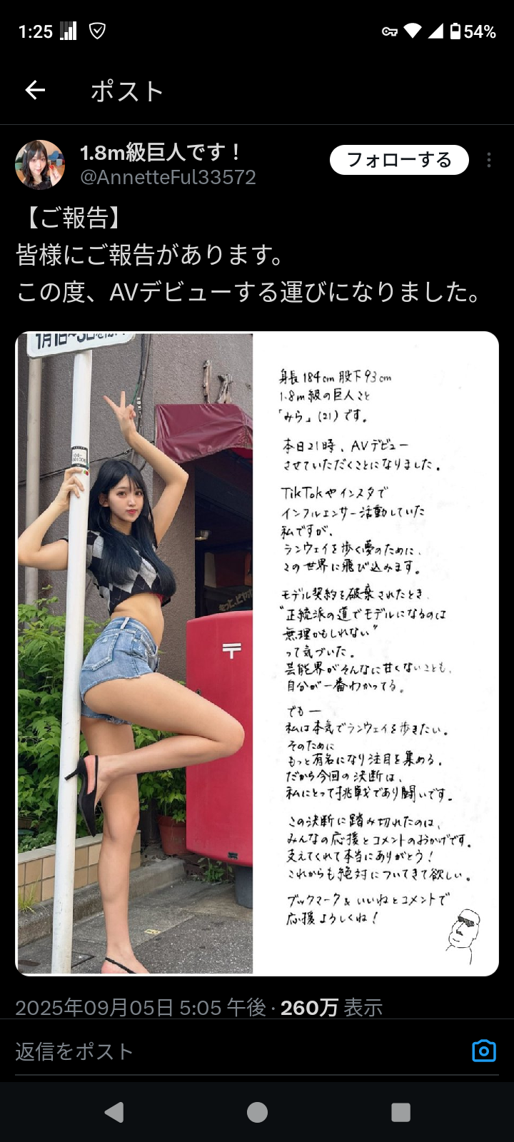 この度、AVデビューする運びになりました。 pic.twitter.com/krGAlAZoKP— 1.8m級巨人です! (@AnnetteFul33572) September 5, 2025