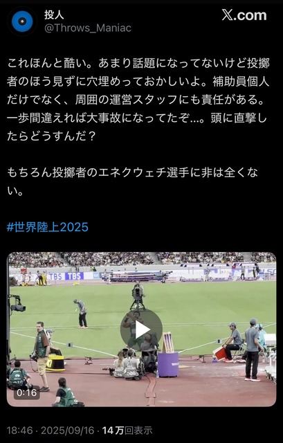 【動画】世界陸上、ガチで人が死ぬかもしれなかった放送事故を起こしてしまう 2025年9月17日 最終更新日時 : 2025年9月17日 ココナラwordpress 広告エリア 【画像】長濱ねる(27歳)、お胸の垂れ具合がヤバイと話題にwwwwwwwwww 【衝撃】ラーメン屋店主ワイ「お客さん、スープ残すのやめてくれねえかなあ???」→結果・・・・! AKB48さん、「お胸選抜」を実施して炎上Feverwwww (※画像あり) 【閲覧注意】例の美人女子高生殺害事件、全てが地獄・・・・・・・・(画像アリ) 趣味で糸会を始めて五年くらいが経った結果wwwwwww 【画像】秋冬仕様のJKの方が好きな奴wwwwwwwwwwwwww 【画像】 美人すぎる女流雀士の胸、エッッッッッッッッッッッッッッッ! 日本人が全然海外ドラマ見なくなった理由wwwww 【画像あり】夜の嬢とおっさんの悲惨すぎるLINEがコチラwwwwwwww→! 【朗報】オタサーの姫ちゃん、男を知って目覚しい成長を遂げる♡♡♡♡♡(画像あり) 【動画】世界陸上、ガチで人が死ぬかもしれなかった放送事故を起こしてしまう 1:名無し :2025/09/16(火) 21:44:13.396ID:csSt1/RyI https://video.twimg.com/amplify_video/1967887757831016448/vid/avc1/1280×720/InQ1hX83szC-vJSR.mp4?tag=14 6:名無し :2025/09/16(火) 21:45:14.926ID:IDHSUmqyn 本人はもちろん気付かない周りの全員ヤバい 11:名無し :2025/09/16(火) 21:46:01.145ID:R2m97h3t3 ファッ!? 13:名無し :2025/09/16(火) 21:46:21.800ID:fbR7prdBf タイミーか? 続きを読む 続きを見る(外部サイト) 広告エリア 【画像】長濱ねる(27歳)、お胸の垂れ具合がヤバイと話題にwwwwwwwwww 【衝撃】ラーメン屋店主ワイ「お客さん、スープ残すのやめてくれねえかなあ???」→結果・・・・! AKB48さん、「お胸選抜」を実施して炎上Feverwwww (※画像あり) 【閲覧注意】例の美人女子高生殺害事件、全てが地獄・・・・・・・・(画像アリ) 趣味で糸会を始めて五年くらいが経った結果wwwwwww 【画像】秋冬仕様のJKの方が好きな奴wwwwwwwwwwwwww 【画像】 美人すぎる女流雀士の胸、エッッッッッッッッッッッッッッッ! 日本人が全然海外ドラマ見なくなった理由wwwww 関連記事 【悲報】元夜職嬢「わたしのパネル写真消して!」店「…」元夜職嬢「…せや!!」→ 織田裕二さん、ギャラ減らされても世界陸上に呼ばれて大喜びwww 【世界陸上】男子3000m障害・三浦龍司選手 メダル目前でケニアのセレム選手に最後のハードルで妨害された疑惑が出る 【世界陸上】村竹ラシッド選手 最高過ぎるwwwwwwwwwwwww