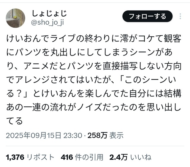 【動画】ぼざろ騒動がきっかけで「けいおん」の澪がコケてパンツを見せるシーンがノイズと話題にwwww