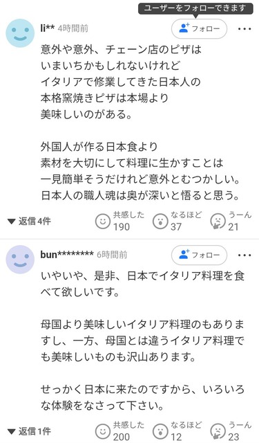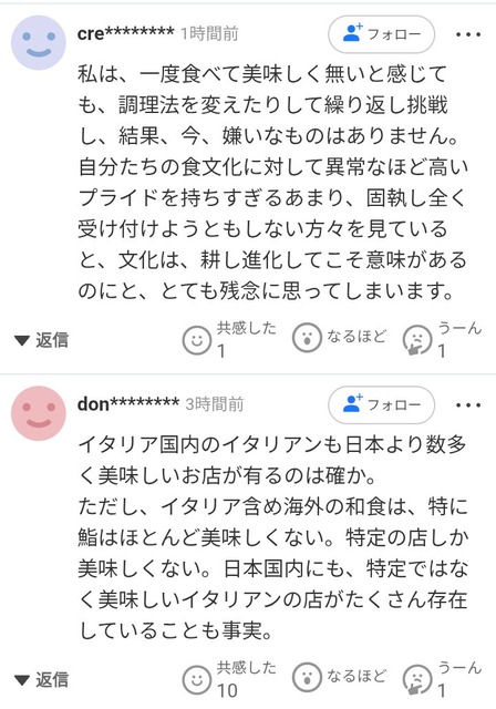 (中略)イタリアでも日本食は人気で、寿司やたこ焼きが食べられるレストランもあるといいます。しかし、ロレンソさんは「“本場”で食べると全然違うよね。まったく別次元!」と、味の違いを強調します。「日本でイタリア料理は絶対食べない。ドミノピザはピザじゃないよ、きっと」冗談めかしながら話すロレンソさんに、マルティーナさんも「イタリアでピザを食べたことある? そのくらい“本場”で食べる料理は違うわよね」と同調しました。全文はこちらhttps://news.yahoo.co.jp/articles/402513bb82f1504f9a86f760b42a999b38fcc92f