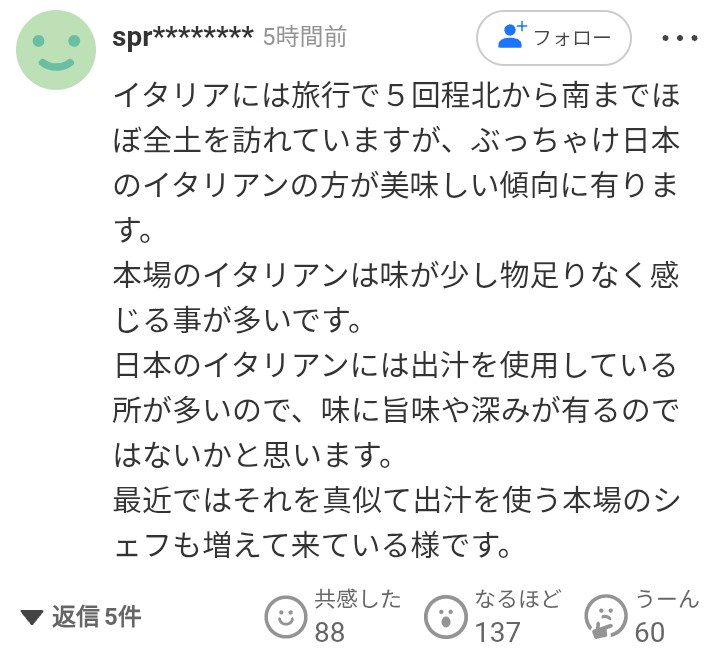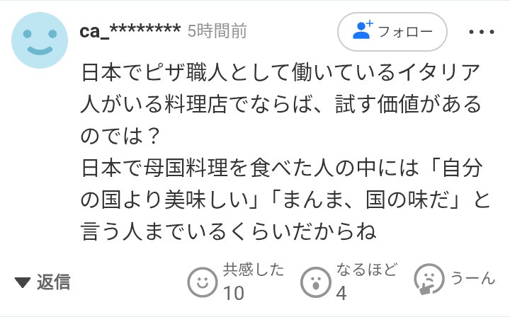 (中略)イタリアでも日本食は人気で、寿司やたこ焼きが食べられるレストランもあるといいます。しかし、ロレンソさんは「“本場”で食べると全然違うよね。まったく別次元!」と、味の違いを強調します。「日本でイタリア料理は絶対食べない。ドミノピザはピザじゃないよ、きっと」冗談めかしながら話すロレンソさんに、マルティーナさんも「イタリアでピザを食べたことある? そのくらい“本場”で食べる料理は違うわよね」と同調しました。全文はこちらhttps://news.yahoo.co.jp/articles/402513bb82f1504f9a86f760b42a999b38fcc92f