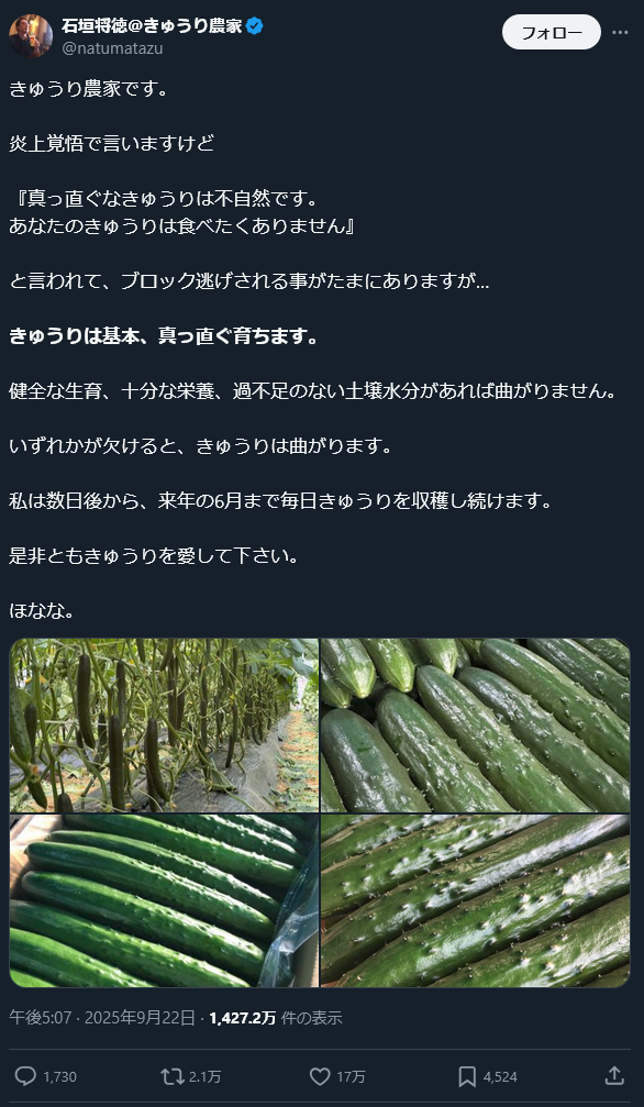 — 石垣将徳@きゅうり農家 (@natumatazu) September 22, 2025