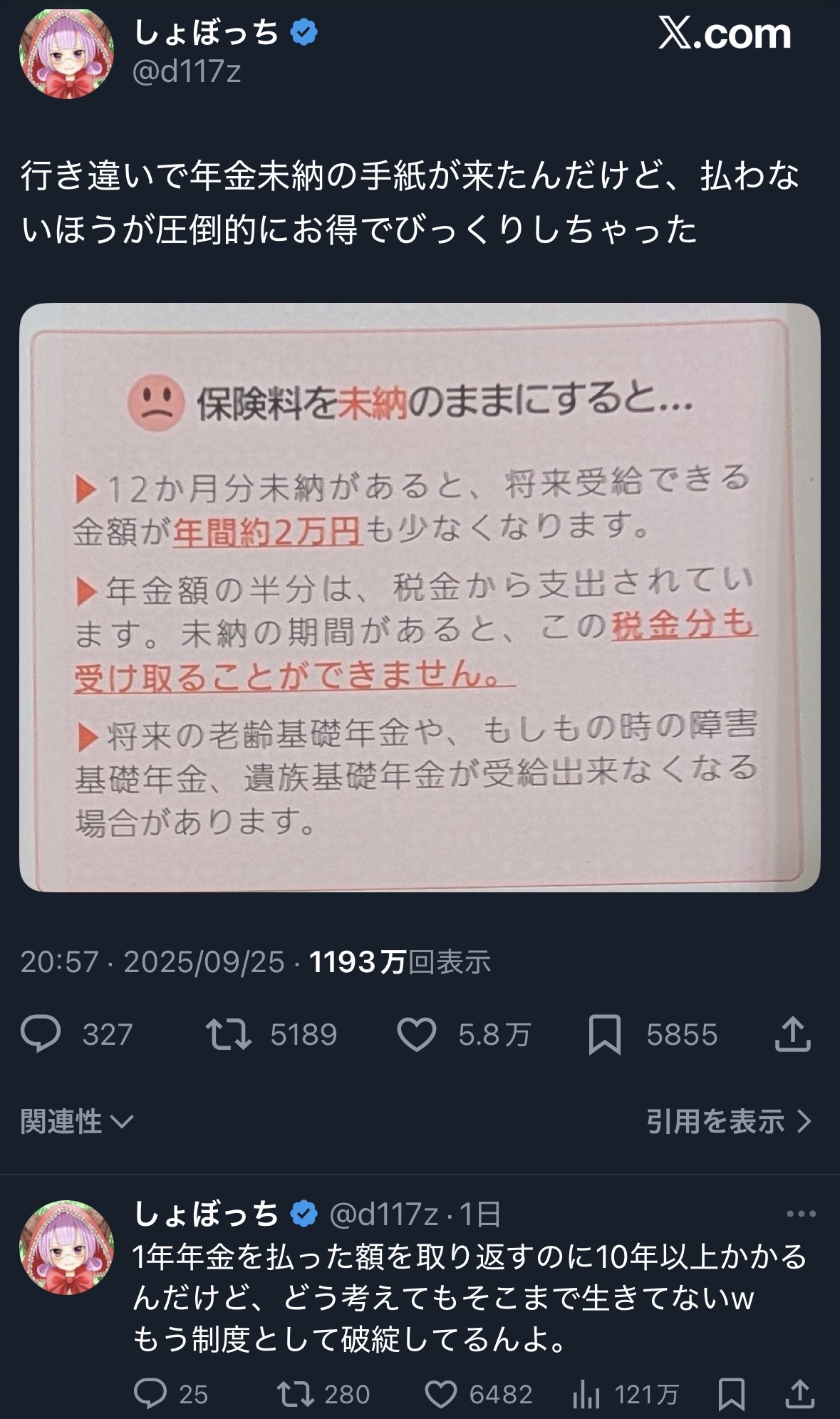 【画像】最近の若者さん、年金を「損得」で考えてしまう・・・・