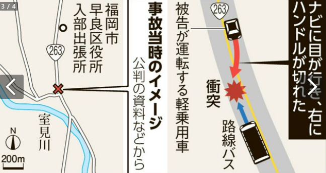24日の判決で、福岡地裁の今泉裕登裁判長は「短くない時間カーナビを脇見して、前方左右を確認するという最も基本的かつ重要な義務を怠った」と指摘。一方、「被告人は、自らの不注意により最愛の二人の我が子を失ったことで、自責の念や喪失感等極めて大きな精神的苦痛に苛まれ、今なお精神科受診を続けている上、自身も長期間の通院を要する重傷を負っている。自らの過失に起因するものではあるものの、本件事故により被告人が多大な打撃を受けたことは、量刑上一定程度考慮すべきである」として、古賀被告に、禁錮3年執行猶予5年の判決を言い渡しました。全文はこちら