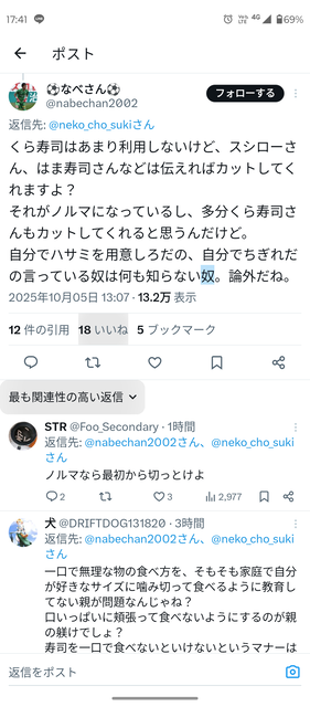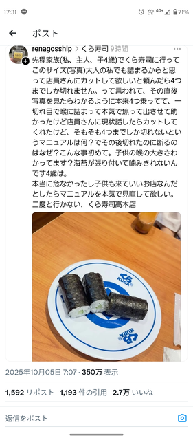 【画像】客「かっぱ巻きをカットしろ」くら寿司「4つまでしかできません」 客「ぱくっ…!!」ゴホッゴホッ