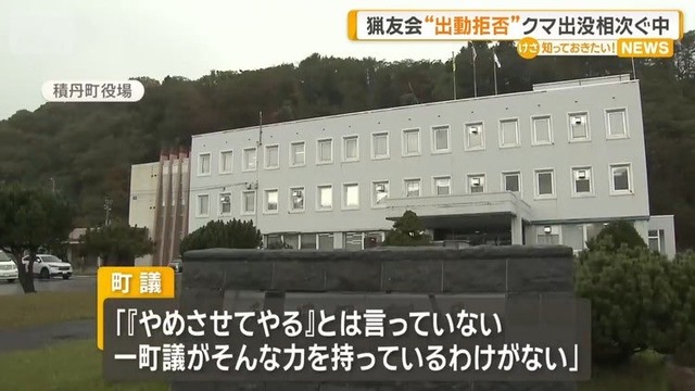 「実際に(クマ)出たら(出動)してもらいたい。心配ですね。おっかない」町議は「『やめさせてやる』とは言っていない。一町議がそんな力を持っているわけがない」と釈明しています。