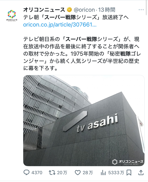 テレ朝「スーパー戦隊シリーズ」放送終了へhttps://t.co/ZZNJkmFpfp