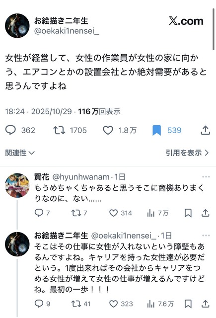 女さん「経営と作業員が女性で、女性の家に向かうエアコン設置会社とか絶対需要があると思う!」
