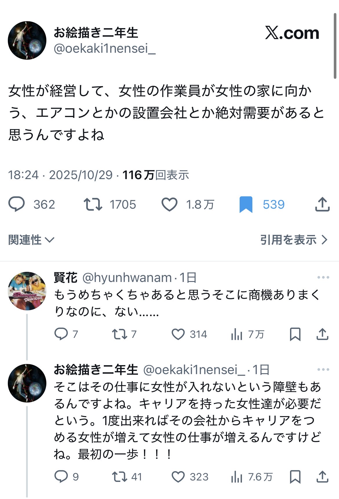 女性が経営して、女性の作業員が女性の家に向かう、エアコンとかの設置会社とか絶対需要があると思うんですよね