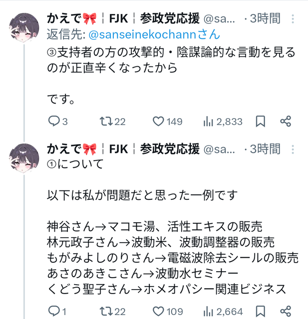 ①参政党の方々が過去にスピリチュアル商品の販売やネットワークビジネスに関与していたことを知り、人として信用できないと思ったから