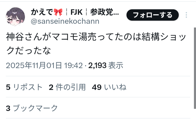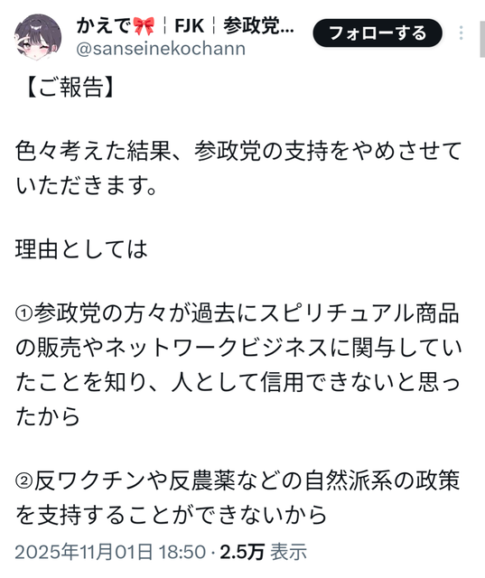 — かえで🎀¦FJK¦参政党応援 (@sanseinekochann) November 1, 2025