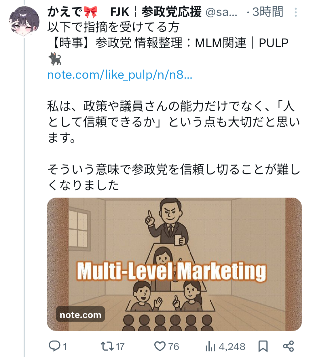 色々考えた結果、参政党の支持をやめさせていただきます。