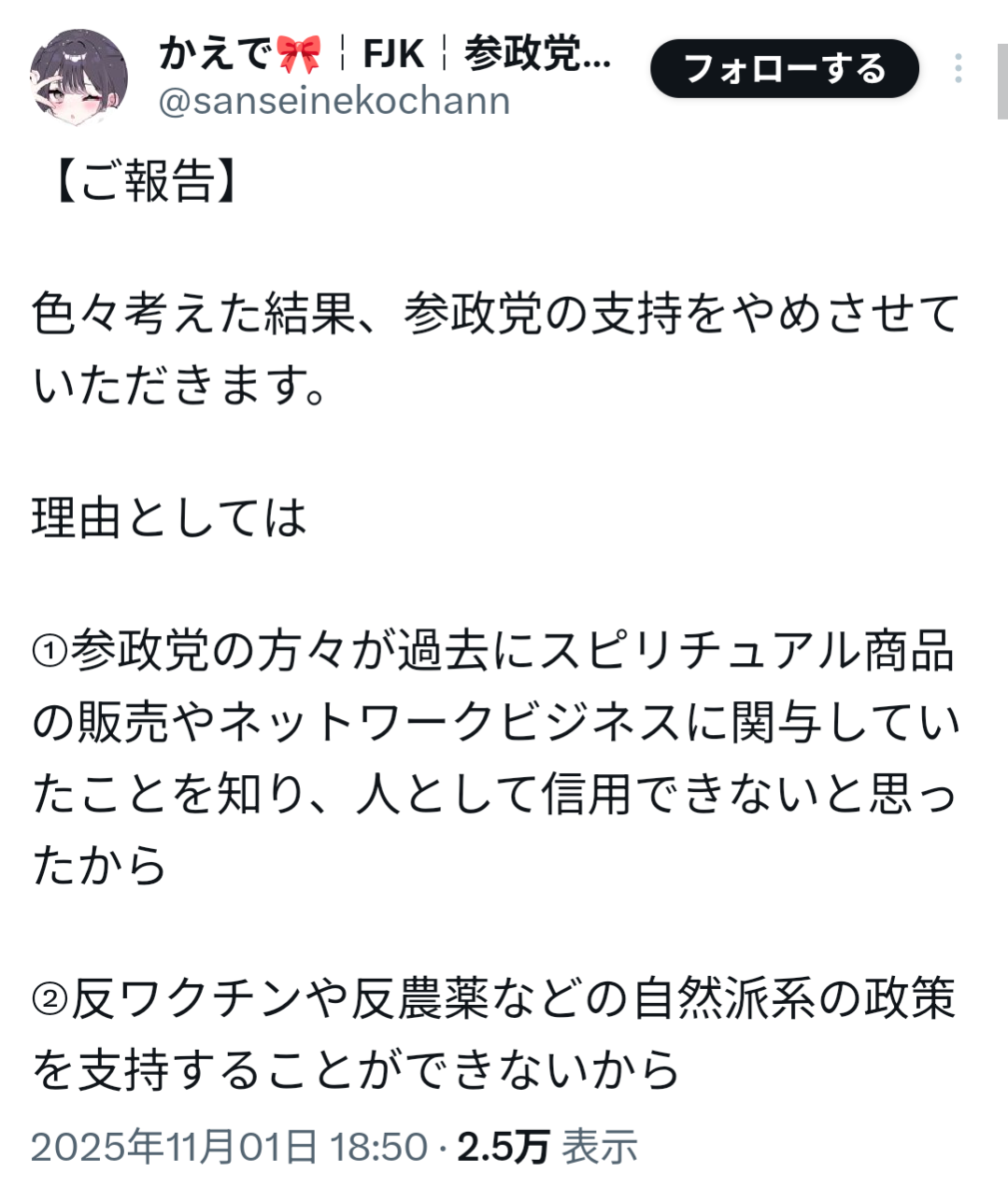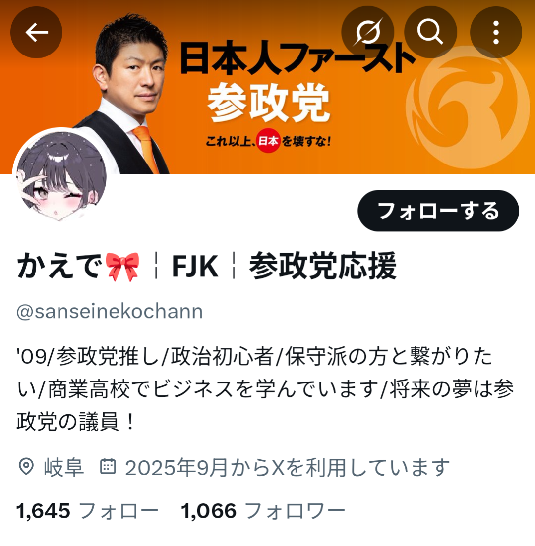 — かえで🎀¦FJK¦参政党応援 (@sanseinekochann) November 1, 2025