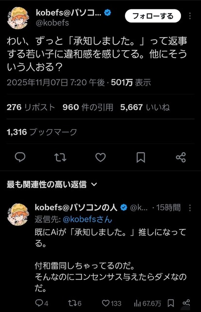 【悲報】Twitter上司「承知しましたって言うやつ多すぎ。AIのせいだろ」