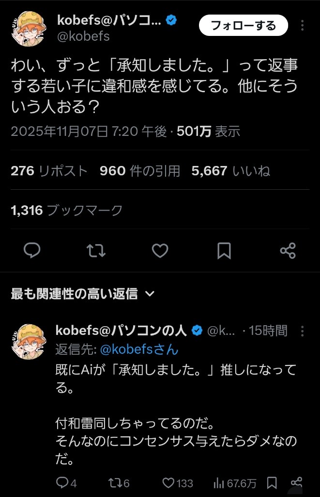 【悲報】Twitter上司「承知しましたって言うやつ多すぎ。AIのせいだろ」