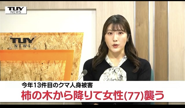 きのう午後、山形県尾花沢市で女性がクマに襲われる被害がありました。クマは柿の木からいきなり降りてきて女性を襲ったと見られていて、女性は顔などにけがをしていますが命に別状はないということです。