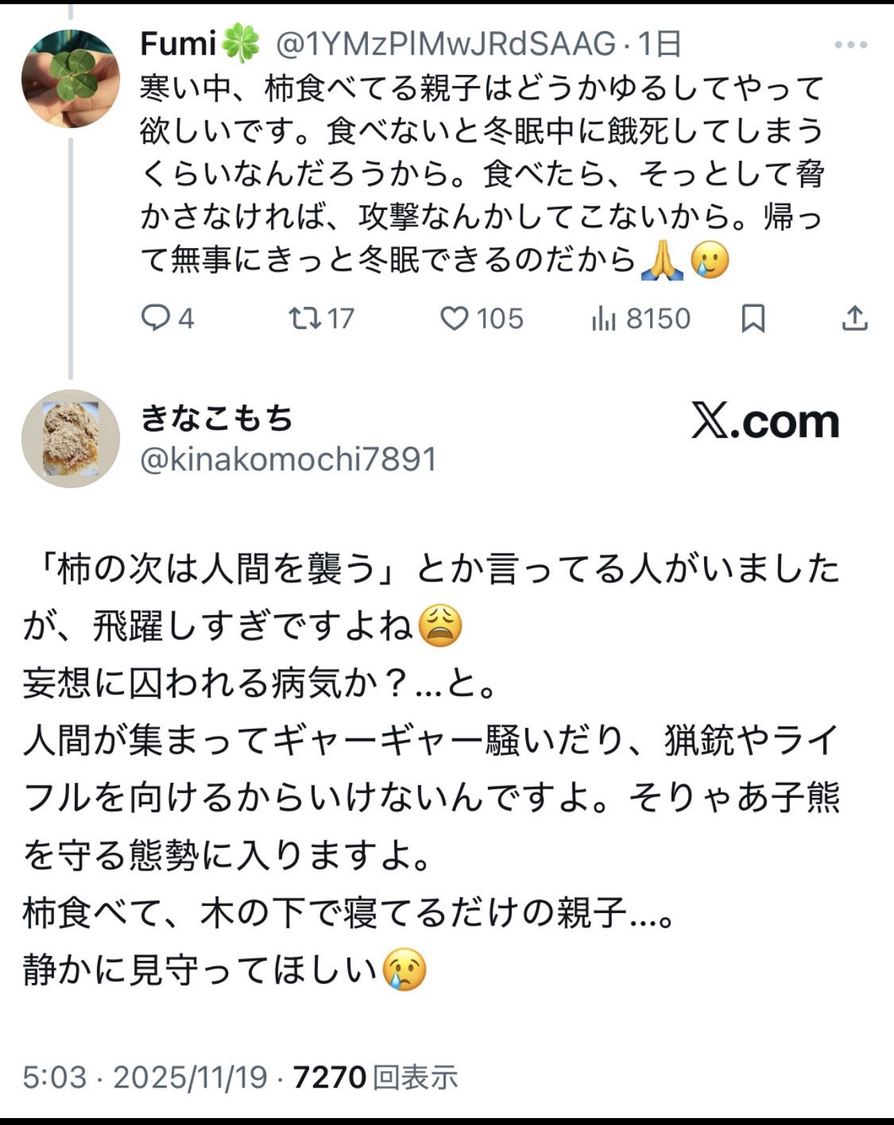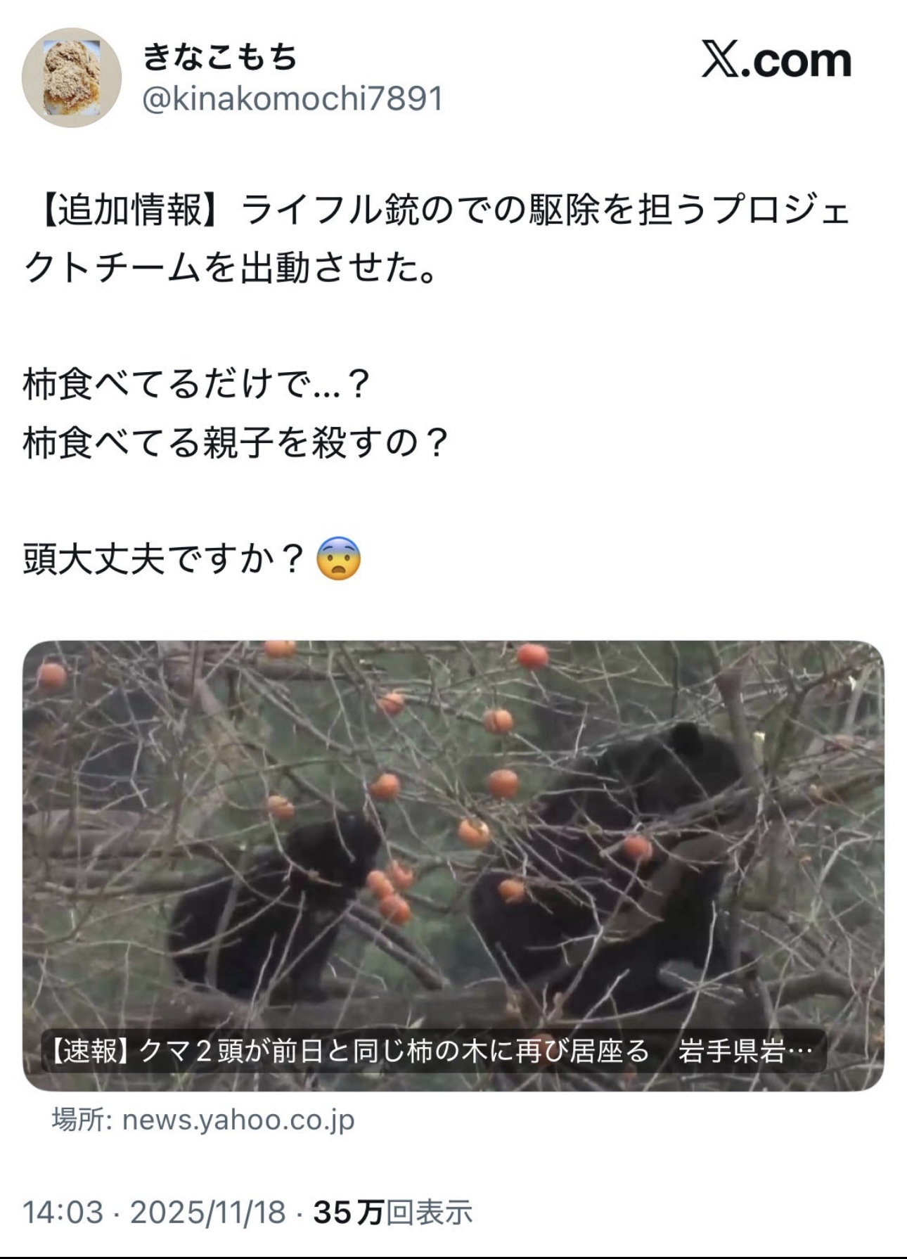 【画像】🐻子供「柿さん美味しいね!」優しい人間「お腹いっぱいになったら山に帰るんだよw」