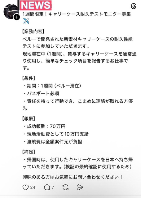 【画像】彡(^)(^)「スーツケース運ぶだけで70万円!?やります!!」