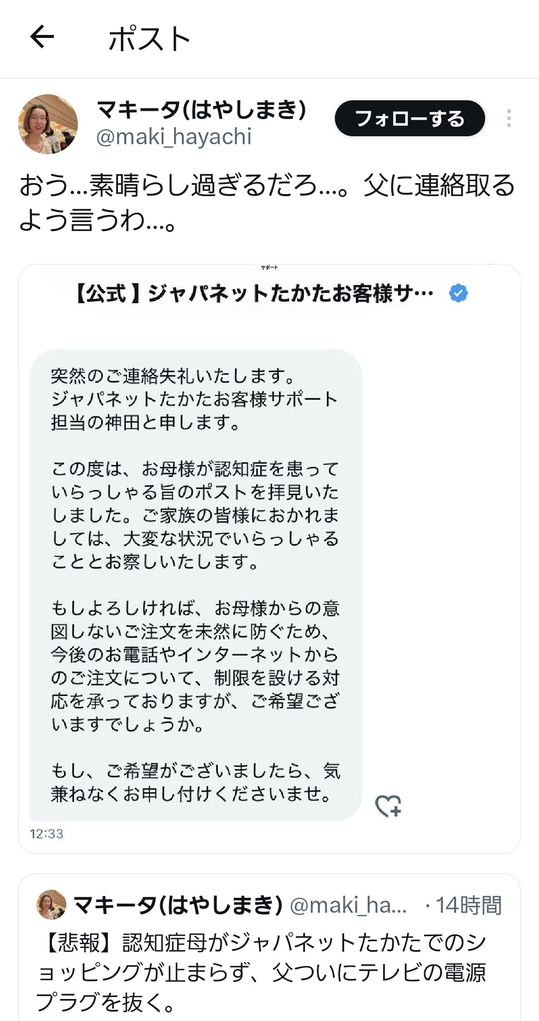 x民「母が認知症でジャパネットたかたでの買い物を繰り返してしまう…」→ 担当者の神対応が話題に