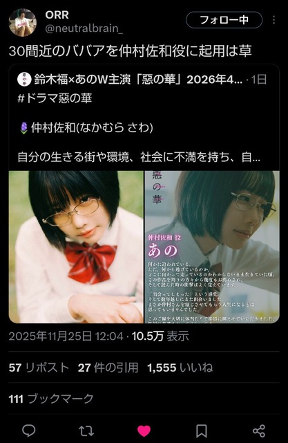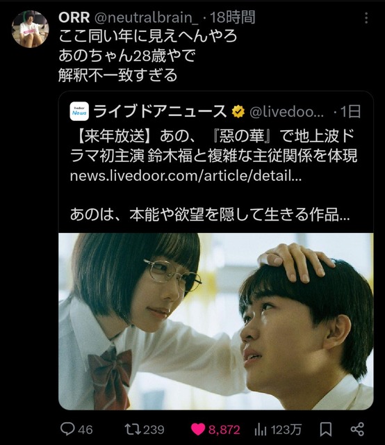 実写版『惡の華』、あのちゃんが起用されるもババァ扱いされてしまうwww