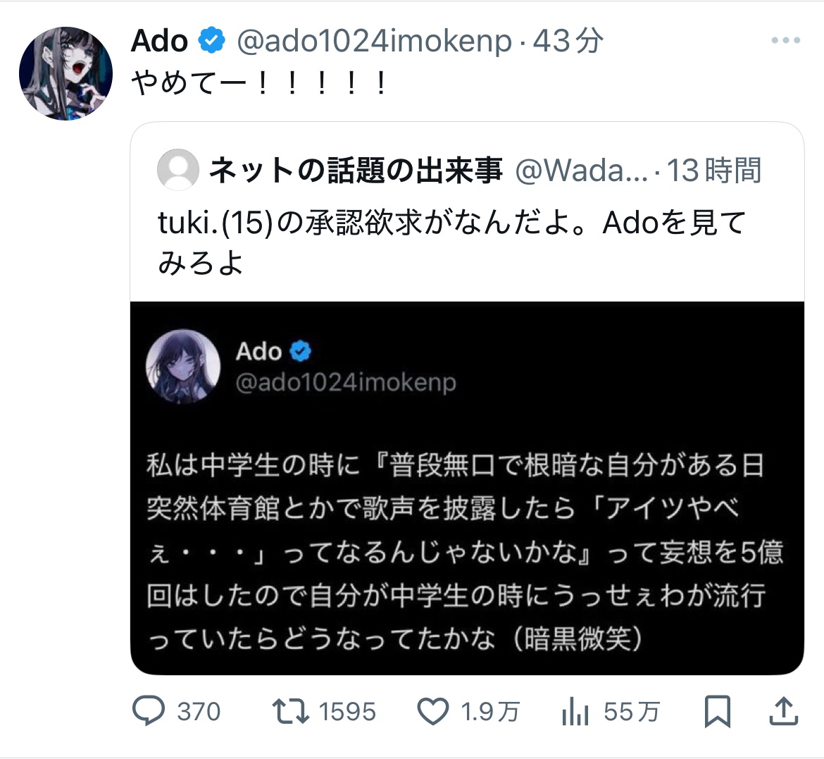 【画像】Adoさん、黒歴史ポストを掘り起こされて絶望してしまうwwww