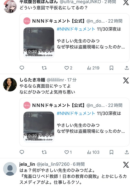 XユーザーのNNNドキュメント【公式】さん: 「#NNNドキュメント 11/30深夜は やさしい先生のひみつ なぜ学校は盗撮現場になったのか 教員らがSNSで盗撮画像を共有した事件に衝撃が走った。現場は安心できるはずの『学校』。 子供を守るべき“やさしい”先生が一体なぜ。 潜入取材で危うさが見えた。 ナレーション #置鮎龍太郎 制作 #中京テレビ https://t.co/reYrgsSHMU」 / X
