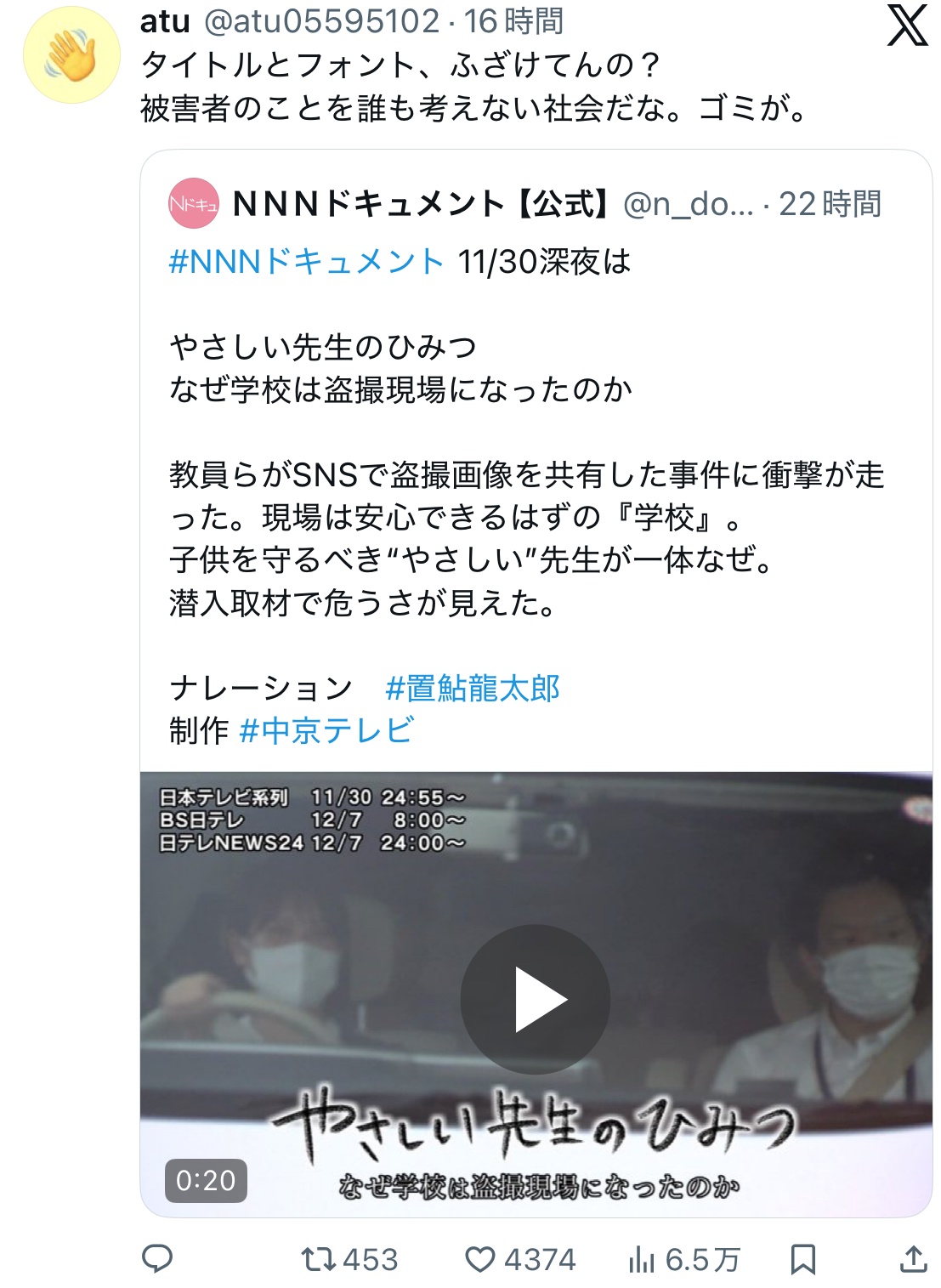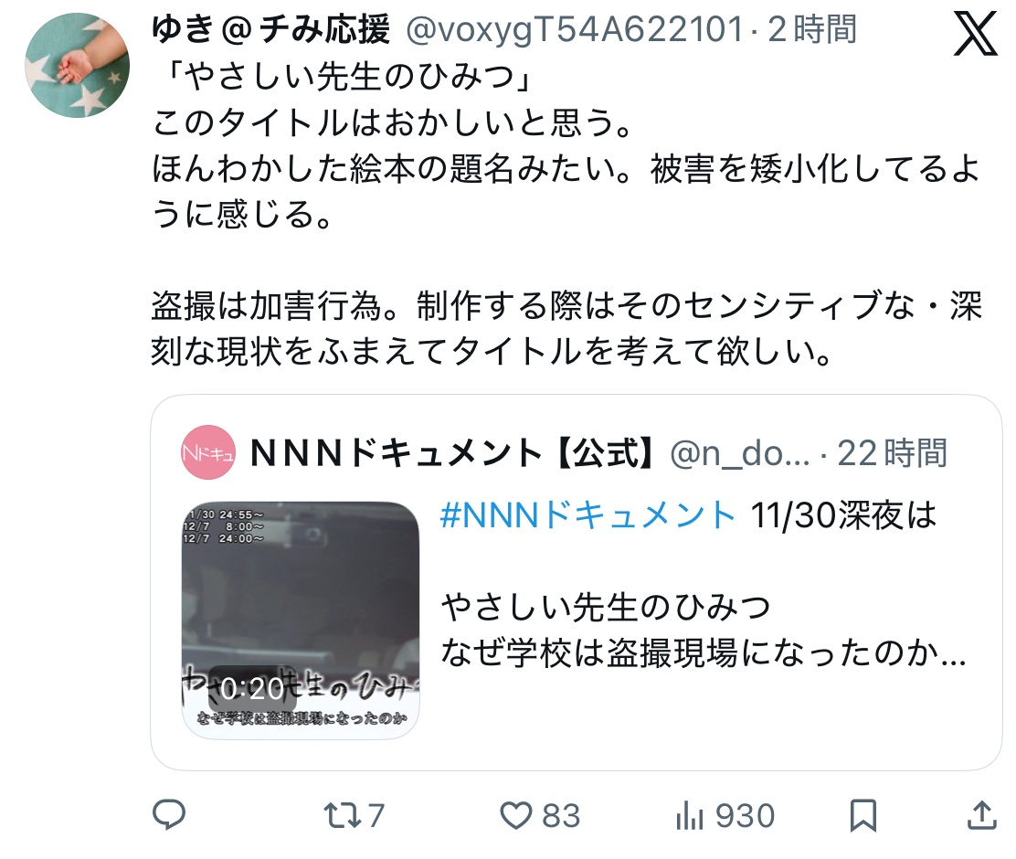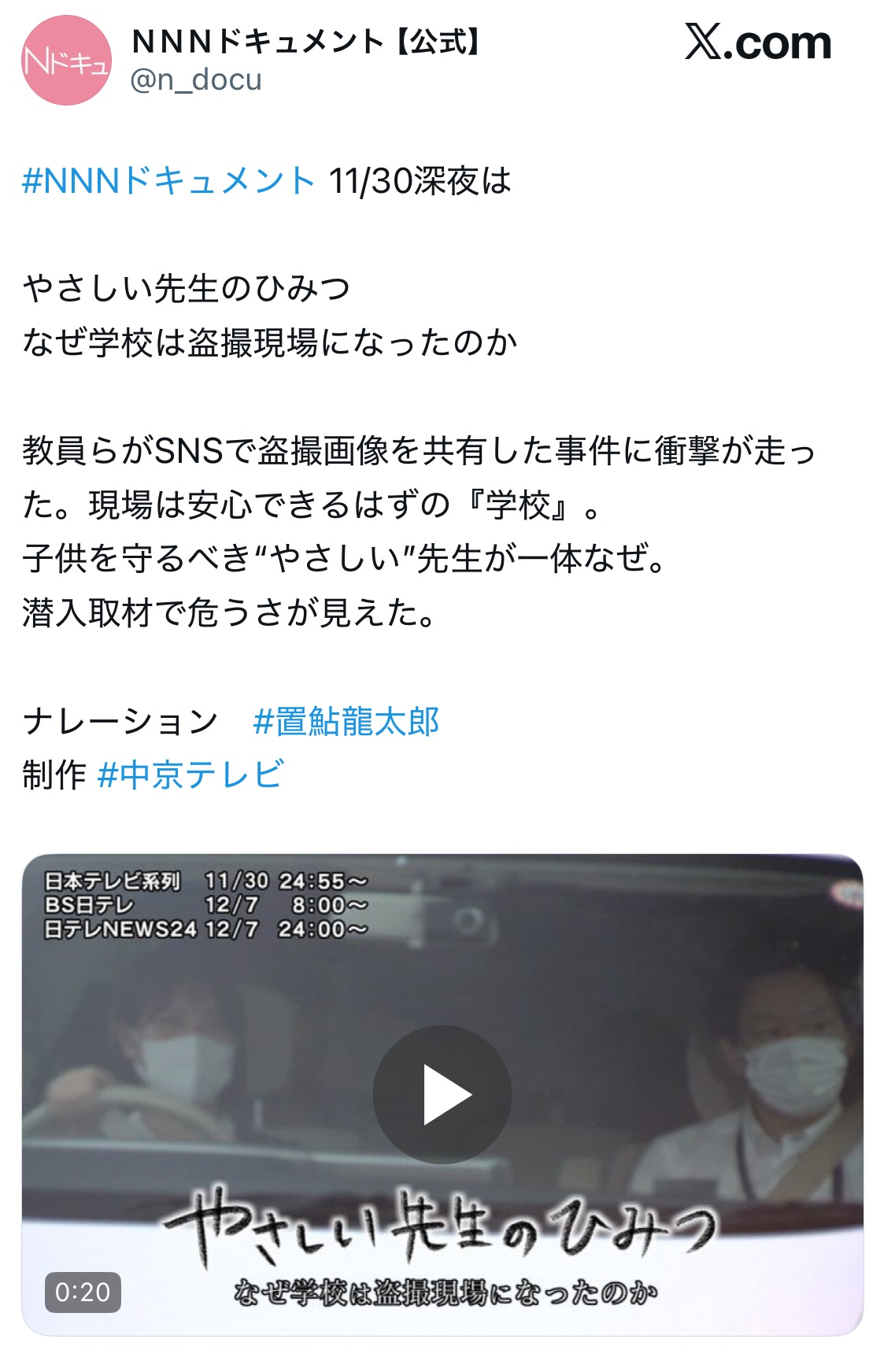 XユーザーのNNNドキュメント【公式】さん: 「#NNNドキュメント 11/30深夜は やさしい先生のひみつ なぜ学校は盗撮現場になったのか 教員らがSNSで盗撮画像を共有した事件に衝撃が走った。現場は安心できるはずの『学校』。 子供を守るべき“やさしい”先生が一体なぜ。 潜入取材で危うさが見えた。 ナレーション #置鮎龍太郎 制作 #中京テレビ https://t.co/reYrgsSHMU」 / X