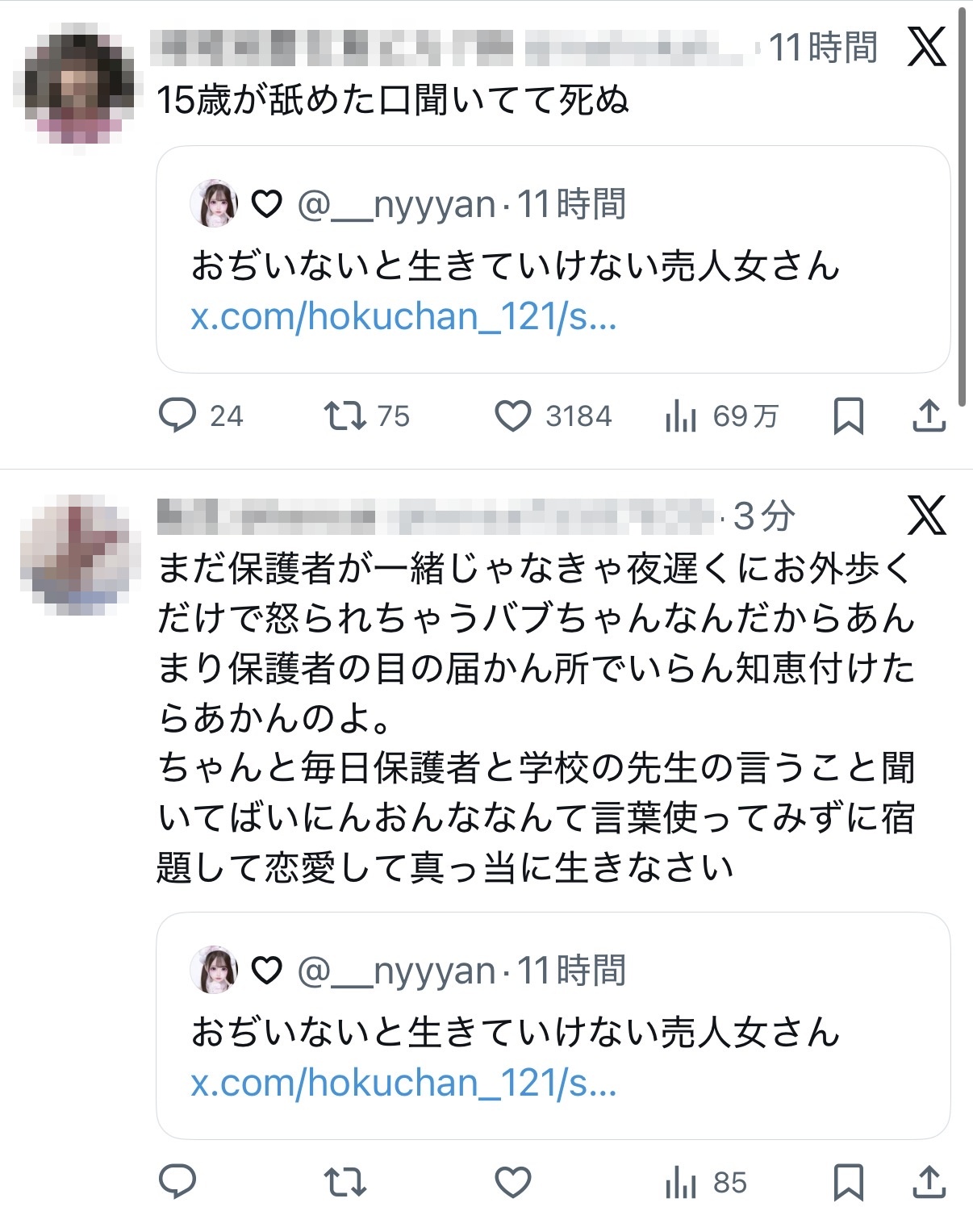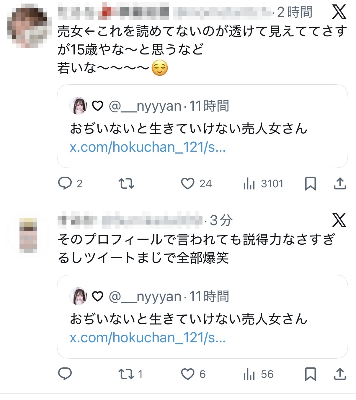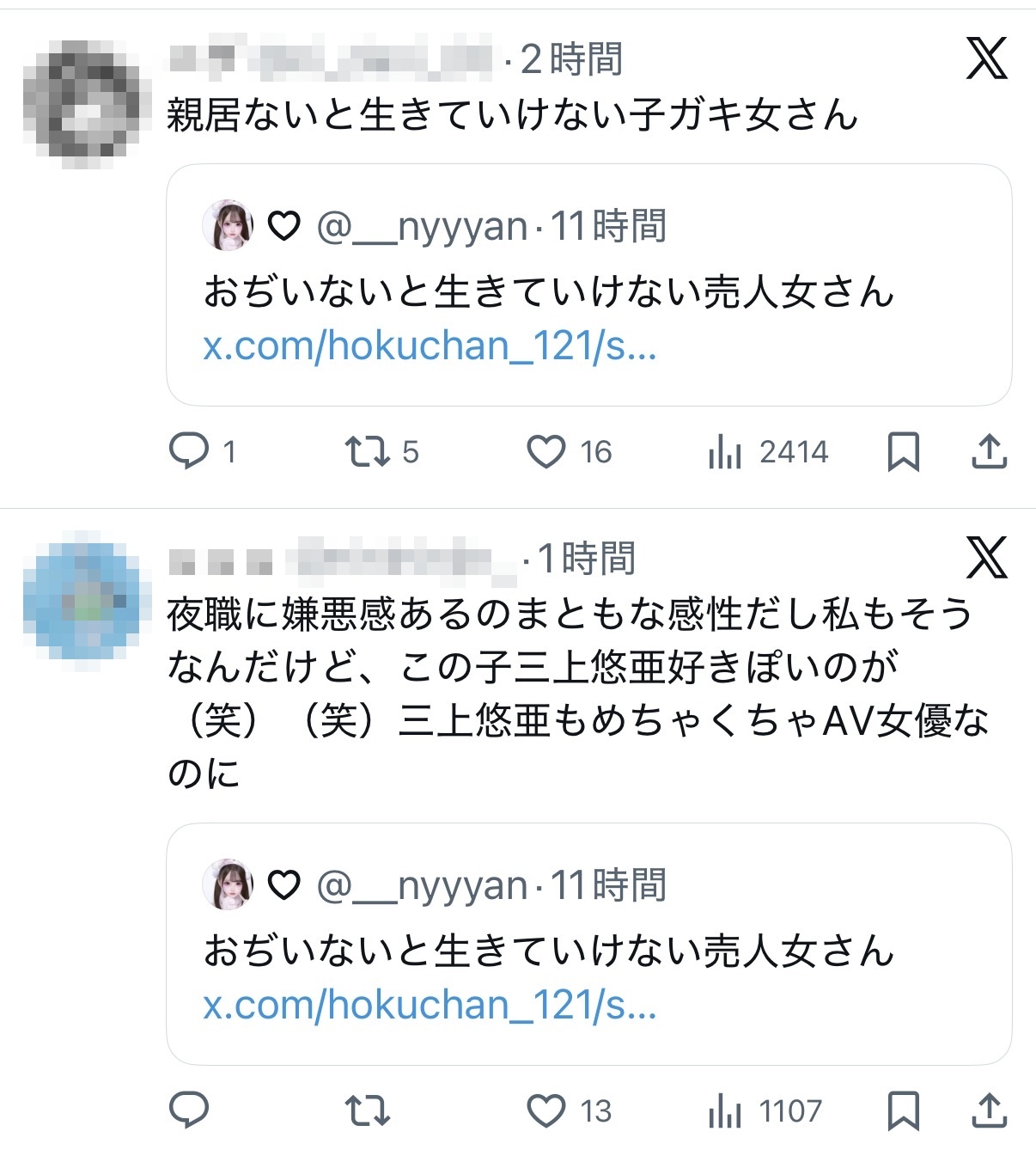 射○することだけ考えろ。 こっちはお前らみたいな誰からも選ばれない残念な容姿のやつが裸になっても泣き叫ばず悲鳴を上げず笑顔でち○こ触る代しか貰ってへんねん。わきまえろカス— がーちゃー (@hokuchan_121) November 29, 2025