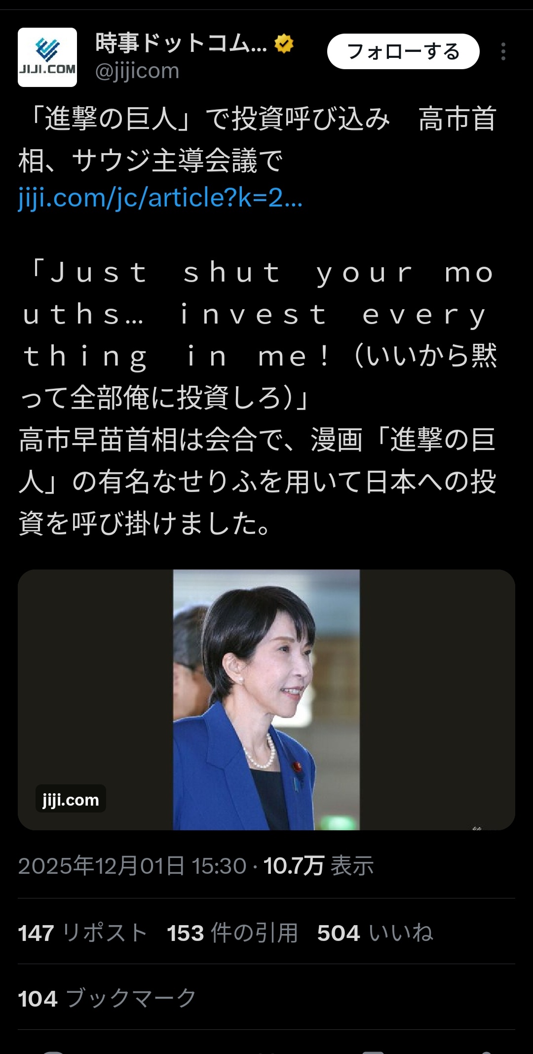 【悲報】高市早苗、進撃の巨人を政治利用してしまうwwww