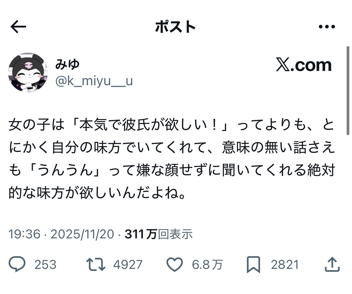 X女性「女の子はね、彼氏が欲しいんじゃなくて意味の無い話でも聞いてくれる絶対的な味方が欲しいの」