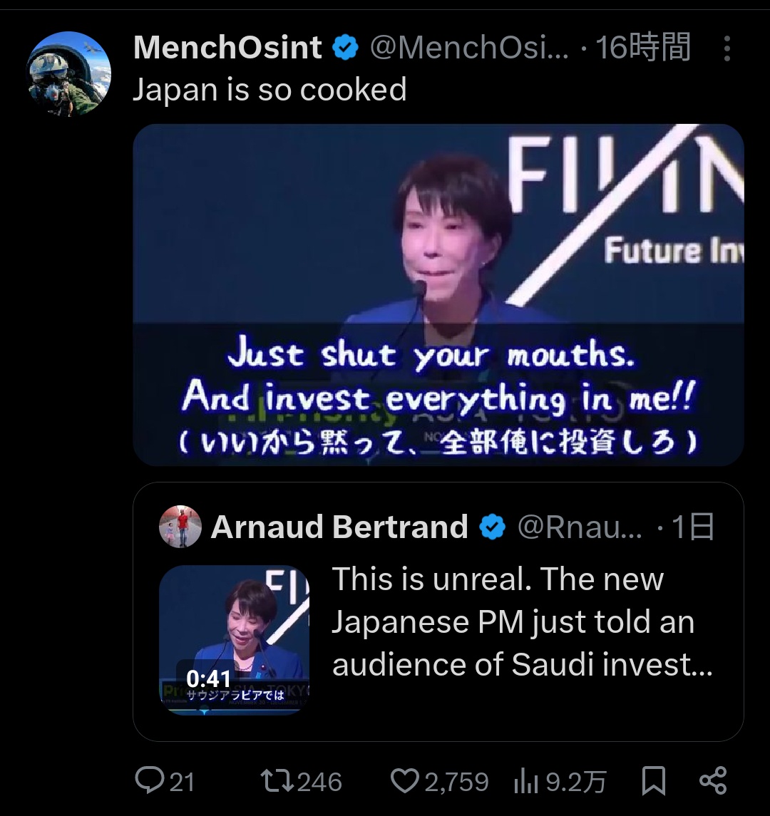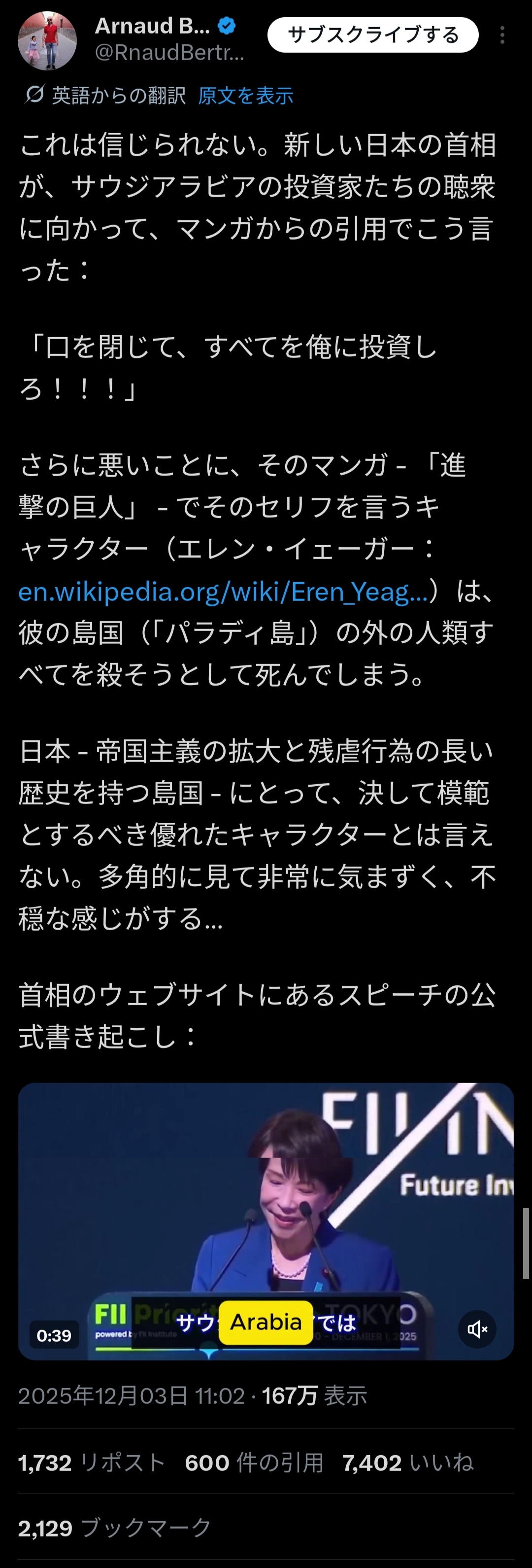 【動画】高市早苗さん、進撃の巨人セリフ引用してガチ国際問題になってしまうwww