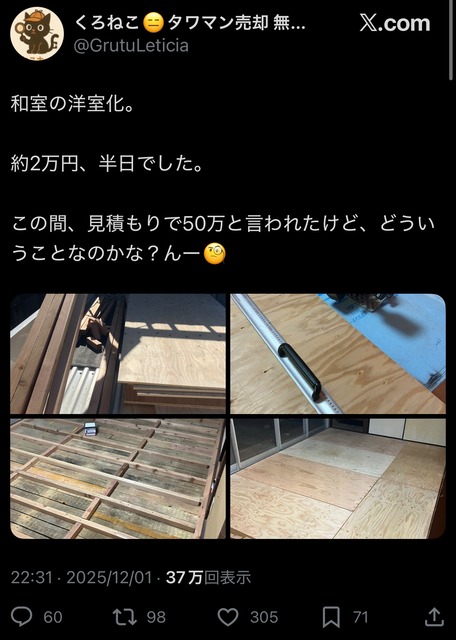 【画像】(ヽ´ん`) 「フローリングの見積50万だったのに、自分でやれば2万。どういうこと?w」
