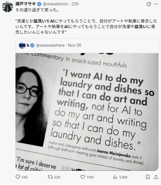 なんでAIが娯楽を奪って、単純作業を人がやる世の中になっていっとんねん
