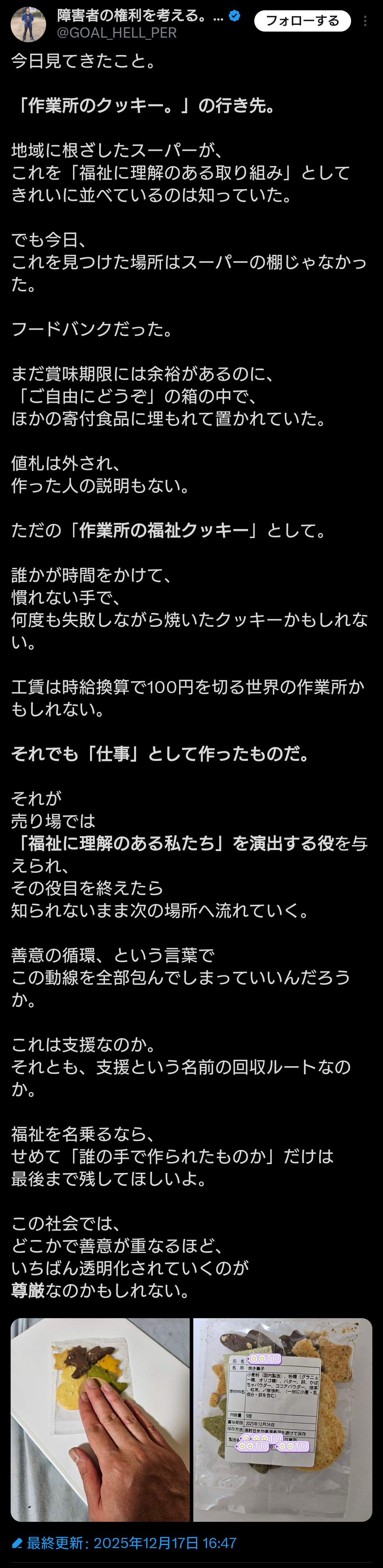 知的障碍者の作った福祉クッキー、卸したスーパーがフードバンクに直流ししていた… 2025年12月20日 最終更新日時 : 2025年12月20日 ココナラwordpress 広告エリア 【画像】ジャム屋さん気づく「もしかして、『瓶』じゃない方が売れるんじゃね…?」→ 【悲報】マッマ「ゴミ捨て行ってきて!」ボク「あいよー」→2時間後マッマ「ごめんなさいごめんなさい・・・・・」→! 億トレ経営者「30過ぎて未婚は『誰にも選ばれなかった』という実績」→ ぐうの音も出ないと話題に… アメリカの「ゲイ」認定 ヤバいwwwwwwwwwwwwww ワイの彼女(31)「例えばさ~、今結婚したいって言ったらワイはいつでもしてくれるじゃん?」ワイ「……」→結果!! 【画像】彡(゚)(゚)「ファッ!?ヤレる確率が見える能力…!?」 PSBlogにて「ゲームカタログ」最新おすすめガイドが公開+PSStoreにてPSPlus加入者限定「BIG WINTER SALE」開催中、『ドラゴンクエスト HD-2D版 ロト三部作セット』『Battlefield™ 6』など 【画像あり】愛子さま、鳥を捕まえてくる!!! 知的障碍者の作った福祉クッキー、卸したスーパーがフードバンクに直流ししていた… 【衝撃】医者「クラミジアだね」女さん「検査しなくても分かるんですね」医者「だって・・・・・・・。」→! 知的障碍者の作った福祉クッキー、卸したスーパーがフードバンクに直流ししていた… 1:名無し :2025/12/18(木) 12:19:18.334ID:XAp1PSgtT 51:名無し :2025/12/18(木) 12:23:10.771ID:MA3yeI91s 最初からフードバンクに卸せばいいってことか 17:名無し :2025/12/18(木) 12:20:58.032ID:Z0zmrJTzp これきつい 作って自家消費だけすればいいのに 続きを読む 続きを見る(外部サイト) 広告エリア 【画像】ジャム屋さん気づく「もしかして、『瓶』じゃない方が売れるんじゃね…?」→ 【悲報】マッマ「ゴミ捨て行ってきて!」ボク「あいよー」→2時間後マッマ「ごめんなさいごめんなさい・・・・・」→! 億トレ経営者「30過ぎて未婚は『誰にも選ばれなかった』という実績」→ ぐうの音も出ないと話題に… アメリカの「ゲイ」認定 ヤバいwwwwwwwwwwwwww ワイの彼女(31)「例えばさ~、今結婚したいって言ったらワイはいつでもしてくれるじゃん?」ワイ「……」→結果!! 【画像】彡(゚)(゚)「ファッ!?ヤレる確率が見える能力…!?」 PSBlogにて「ゲームカタログ」最新おすすめガイドが公開+PSStoreにてPSPlus加入者限定「BIG WINTER SALE」開催中、『ドラゴンクエスト HD-2D版 ロト三部作セット』『Battlefield™ 6』など 【画像あり】愛子さま、鳥を捕まえてくる!!! 関連記事 【衝撃】医者「クラミジアだね」女さん「検査しなくても分かるんですね」医者「だって・・・・・・・。」→ 【衝撃】医者「クラミジアだね」女さん「検査しなくても分かるんですね」医者「だって・・・・・・。」→! 【衝撃】医者「クラミジアだね」女さん「検査しなくても分かるんですね」医者「だって・・・・・・・。」→! 【画像】美女さん、ナチ敬礼してしまうwwwwwww