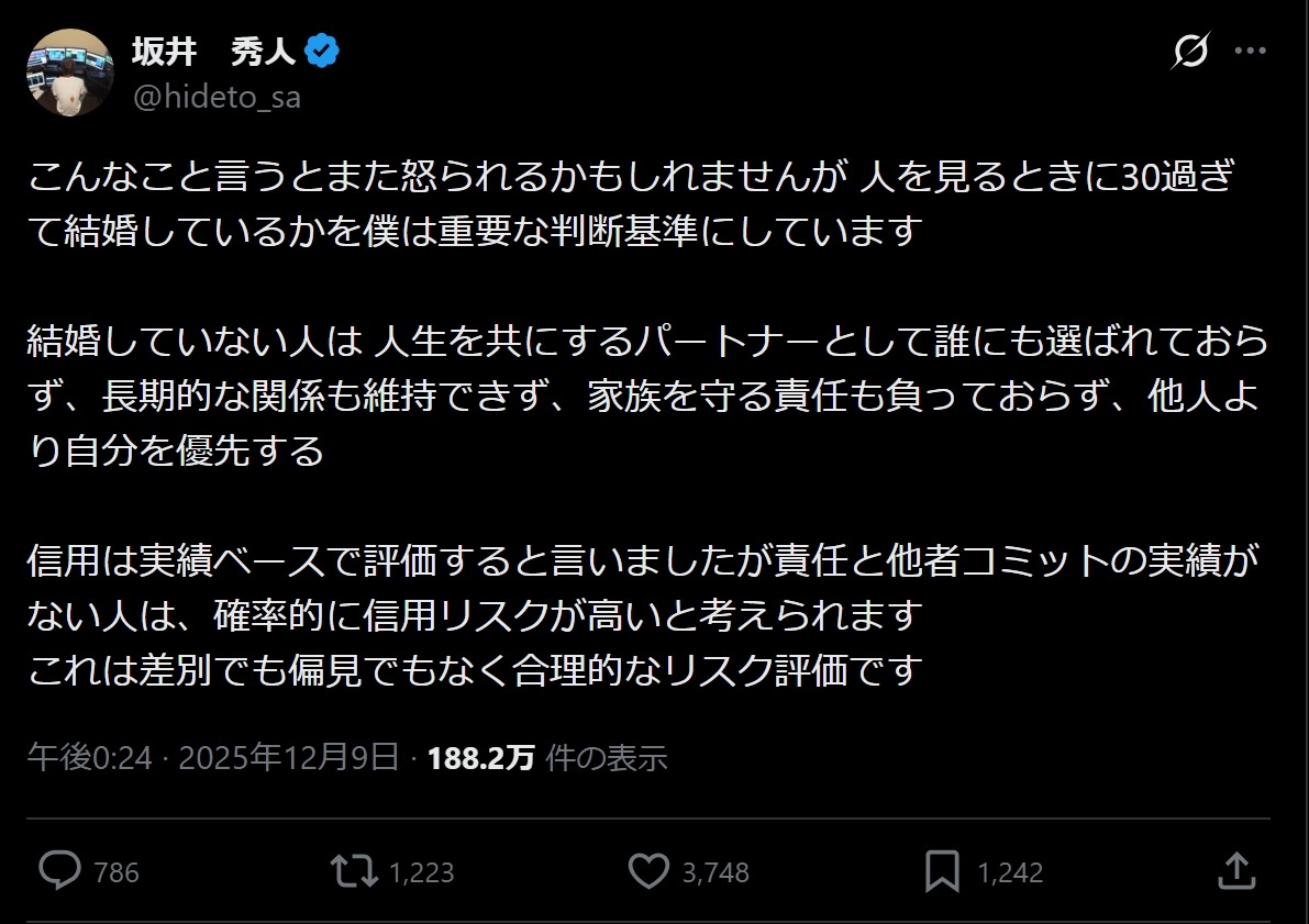億トレ経営者「30過ぎて未婚は『誰にも選ばれなかった』という実績」→ ぐうの音も出ないと話題に…