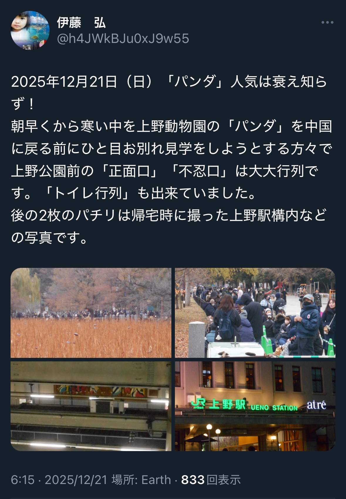 後の2枚のパチリは帰宅時に撮った上野駅構内などの写真です。 pic.twitter.com/ugxN64YLwb— 伊藤 弘 (@h4JWkBJu0xJ9w55) December 20, 2025