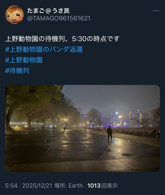 上野動物園の待機列、5:30の時点です#上野動物園のパンダ返還 #上野動物園#待機列 pic.twitter.com/kofswGpLAL